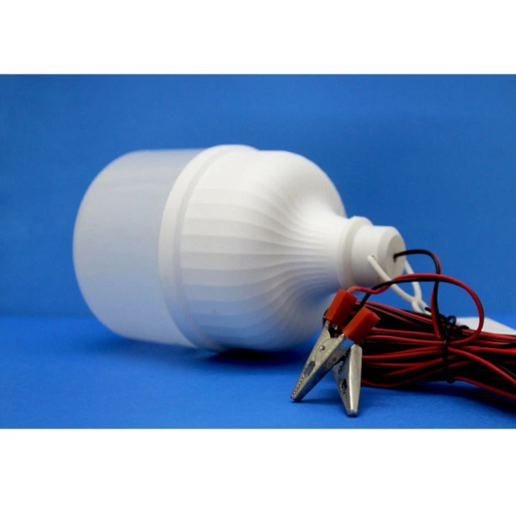 این لامپ با باطری ماشین و موتور روشن می شود دارای قلاب آویز جهت اویزان کردن اط سقف یا شاخه درختان یا کاپوت ماشین و دو عدد گیره سرباطری و سیمیکمتری می باشد