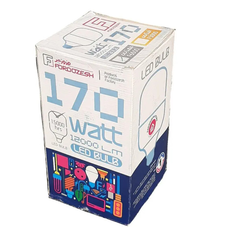 لامپ ال ای دی 170 وات فروزش با نور عالی و بدون فلیکر جنس عالی گارانتی عالی قیمت عالی.مشخصات فنی: شکل: استوانه ای توان: 170 وات ولتاژ اسمی: 220 ولت منبع نور: SMD رنگ نور: سفید مهتابی 6500 کلوین و سفید آفتابی (زرد) 3000 کلوین شاخص نمایش رنگ CRI: بیش از از 80 میزان روشنایی: 3500 لومن سایز سرپیچ: E27 زاویه تابش: 180 درجه فاقد اشعه های مادون قرمز (IR) و ماوراء بنفش (UV) شرکت سازنده: فروزش