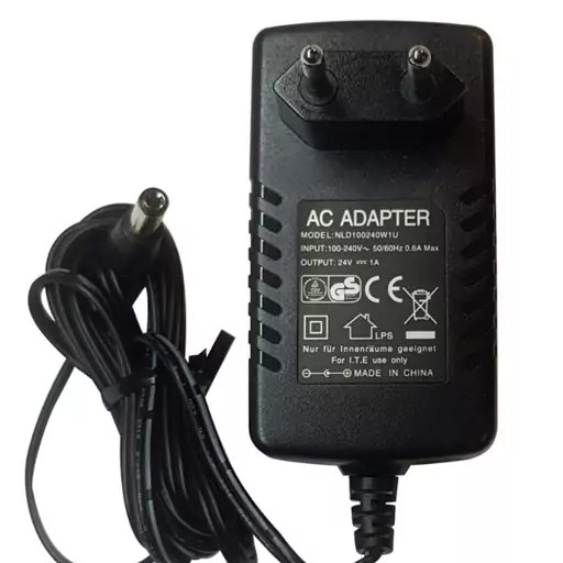 آداپتور 24 ولت 1 آمپر یک منبع تغذیه الکتریکی است که برای تأمین نیازهای برقی دستگاههای الکترونیکی با ولتاژ و جریان مشخص 24 ولت 1 آمپر استفاده می شود. این آداپتور معمولاً از جریان AC (جریان متناوب) ورودی به ولتاژ DC (جریان مستقیم) خروجی، با فرکانس و ولتاژ ورودی مشخص، استفاده می کند.