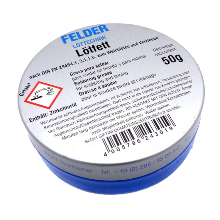 - کیفیت بسیار عالی و مرغوب نسبت به قوطی زرد و قوطی آبی - وزن خاص: ۵۰ گرم - حاوی کلرید روی (ZnCl۲) - قابل استفاده برای لحیم کاری لوله های مسی و آلیاژهای مس ، برنج به دلیل کیفیت بالای محصول - ساخت کشور آلمان